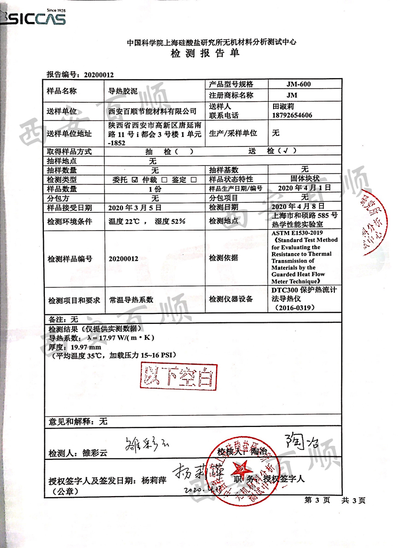 西安百順節(jié)能材料有限公司成立于1998年,二十五年來(lái),我們專心、專注于導(dǎo)熱膠泥產(chǎn)品的研發(fā)、生產(chǎn);企業(yè)通過ISO9001:2015質(zhì)量管理體系認(rèn)證,制定了Q/BS 001-2020《無(wú)機(jī)型導(dǎo)熱膠泥》企業(yè)標(biāo)準(zhǔn),經(jīng)過不斷的研發(fā)、優(yōu)化,成功開發(fā)、生產(chǎn)、銷售了針對(duì)不同工藝、不同材質(zhì)、方便施工的JM-250、JM-600、JM-800、JM-1000系列導(dǎo)熱膠泥,年生產(chǎn)能力2000噸;